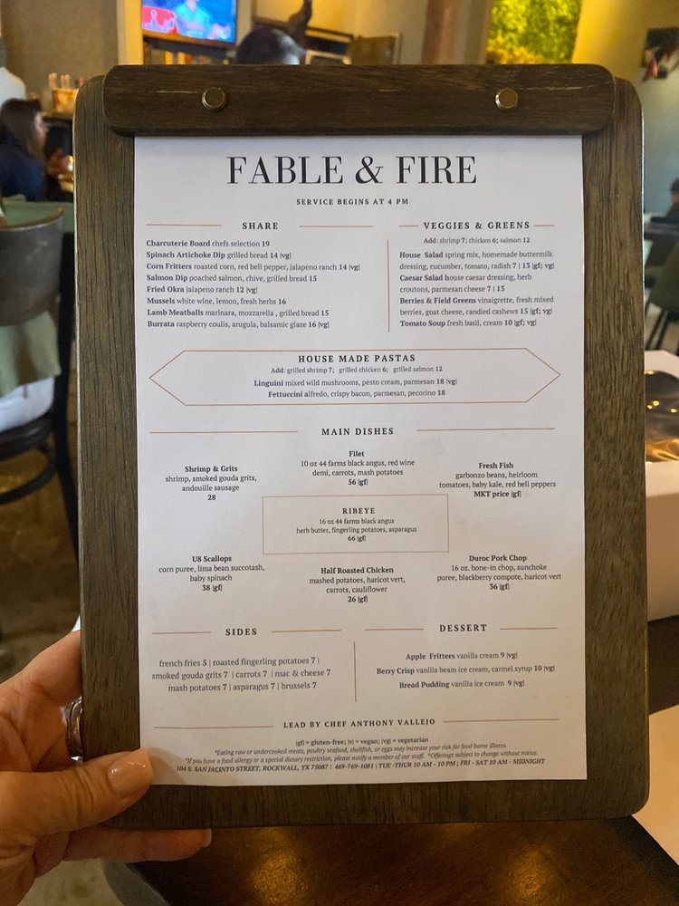 Welcome to Fable and Fire, a whimsical and cozy salad haven in Rockwall, Texas. This charming spot offers a variety of fresh veggies & greens like Berry Field Caesar Salad and House Salad, mouth-watering share options including Brussel Sprouts and Charcuterie Board, and a delectable Tomato Basil Soup. Customers praise the delightful ambience, with bookshop-style restroom doors adding to the rustic charm. While some mention the need for improvements in certain dishes like the Caesar Salad, others rave about the thoughtfully prepared food, like the crispy-skinned roasted chicken and flavorful lamb meatballs. The restaurant's unique concept, combining a bistro atmosphere with a bookstore, adds to its appeal. Whether for brunch or dinner, Fable and Fire promises a culinary experience worth returning for.